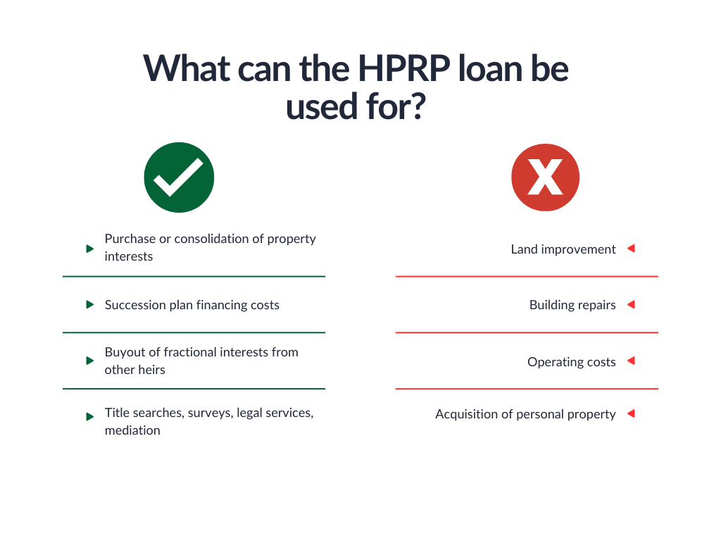 Many heirs’ property owners are unable to qualify for USDA loans, disaster assistance, or cost-share programs because no single heir has documented ownership. HPRP addresses this by providing loans—through nonprofit lenders and community development institutions—that allow families to consolidate ownership, buy out other heirs, or cover legal costs tied to clearing title.